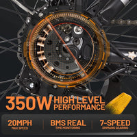 - CONDITION - 20” Aluminium Alloy Frame. Max Load: 200Lb. Mechanical Brake system: Front V brake and rear disc brake. 350W Brushless high-speed Gear Motor. Max travel range up to 20 miles under pure electric mode and 36 miles in pedal assisted mode.