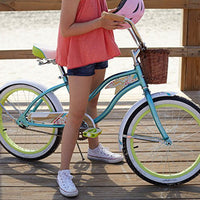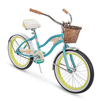 Panama Jack is an inspiration of island paradise, of dreamy relaxation and tropical luxury, and that makes this one easy, breezy cruiser. Ideal for ages 5-9 and a rider height of 44-56 inches, this Panama jack cruiser has an alloy quick release for easy seat height adjustment and an adjustable handlebar to ensure the right fit. Designed with the perfect fit frame, this single-speed cruiser may be the most comfortable bike shell ever to ride. The perfect fit frame places the seat farther back, with a lower center of gravity. This design, with swept-back handlebars, enables a more upright, comfortable riding position with full leg extension and eliminates wrist, arm, neck, and leg fatigue. When she is stopped, her feet can rest flat on the ground. That provides better balance and control and increases riding confidence. This Panama jack cruiser is simple to ride and has a lightweight aluminum frame (much lighter than steel) that delivers more rolling momentum so it's easier to pedal for speed and acceleration. The rear coaster brake provides dependable control, just pedal back to stop; kickstand included. Lime green splashes on the seat and wheels have combined with the ocean blue frame to promote the feel of riding on the beach. You can almost hear the waves crashing on the sand! the clear coat over the frame's graphics ensures it will keep its fabulous appearance, year after year. The soft, cork-style grips maintain a light touch, ride after ride. The roomy wicker basket is perfect for carrying lunch and drinks, bouquets of gathered flowers, or just favorite collectibles. The juicy, tropical flowers on the chainguard and frame insert add a luxurious laid-back feel for this beautiful ride. Generously padded for real comfort for the rider, the seat is stitched with lime green piping and printed with the Panama Jack logo in the back to accent the plush look; dual springs add additional comfort as they help you glide over light bumps and dips. The wide black tires, with white sidewalls, provide good traction while the splash-resistant fenders block unexpected surprises from puddles. An inspiration from paradise, a design of pure comfort, a beautiful view of the tropics, and a joy to ride this Panama jack cruiser just beckons you to come to ride near the shore. Huffy, we make fun!.
