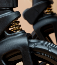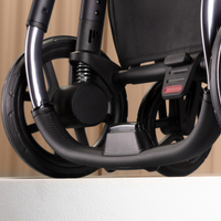- Extra-large rear wheels with deep tread and exposed springs ensure there are no bumps on the road, whatever the terrain.