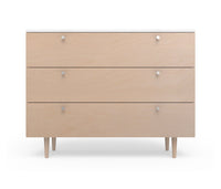 A wider 45" version of the popular mid-century inspired 34" Ulm Dresser. Featuring classic shaped pulls and overall design simplicity with straight forward lines resting atop solid birch turned and tapered legs. Made from beautiful and sustainably harvested birch plywood and green grade MDF made from 100% recycled/reclaimed wood. The 45" wide Ulm Dresser offers three large drawers with self closing/soft close drawer slides. Includes safety strap that is mounted to wall, for extra safety and stability. Removable Changing Tray available available in all white.