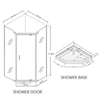Two fixed glass panels and one pivot door, one white acrylic shower base, stainless steel door pull, and support bar on top and bottom, including all hardware and accessories.